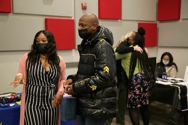 To the right, parents from our three-month paid outreach program (designed and co-led by Maxine Rishton)—trained in leadership and community engagement—worked to connect families in need with our services.